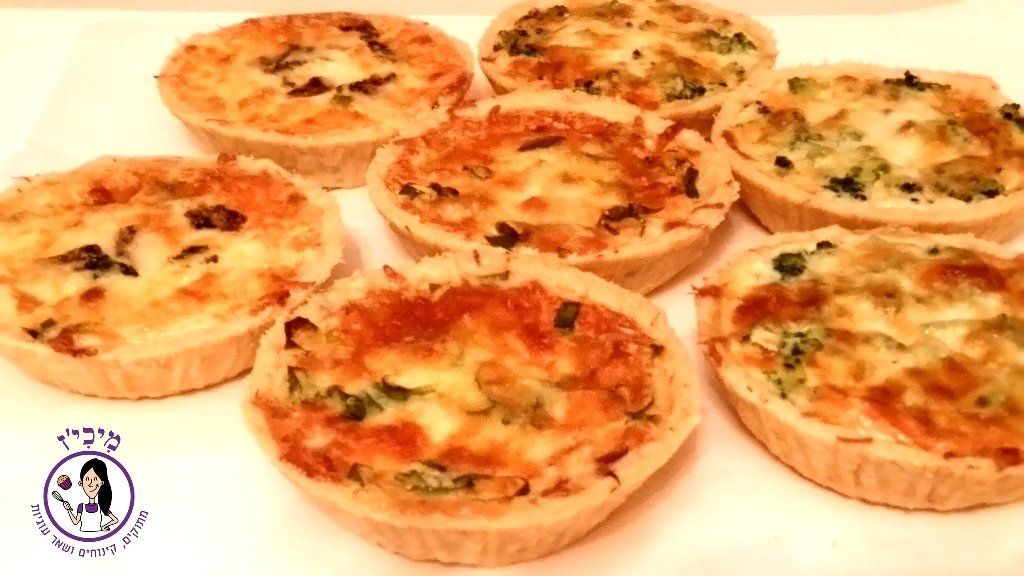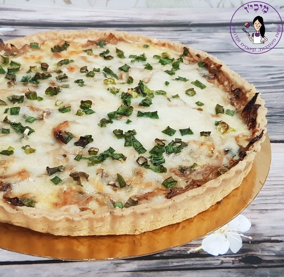 קיש הבצל שלנו עשויי מבצק פריך מלוח, רוטב רויאל, תערובת של מוצרלה ופרמזן