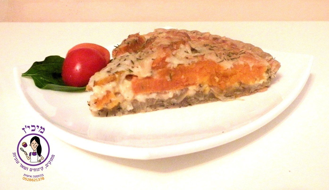 קיש הבטטה שלנו עשוי מבצק פריך מלוח, רוטב רויאל, תערובת של קשקשבל פרמזן ובטטה.